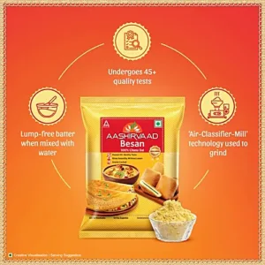 • Aashirvaad Besan provides a lump-free batter when mixed with water, making it an ideal ingredient in our favourite preparations. From sweet to savoury, Aashirvaad Besan adds delightful flavour to all your dishes like Pakoda, Chilla, Besan laddoo and many others